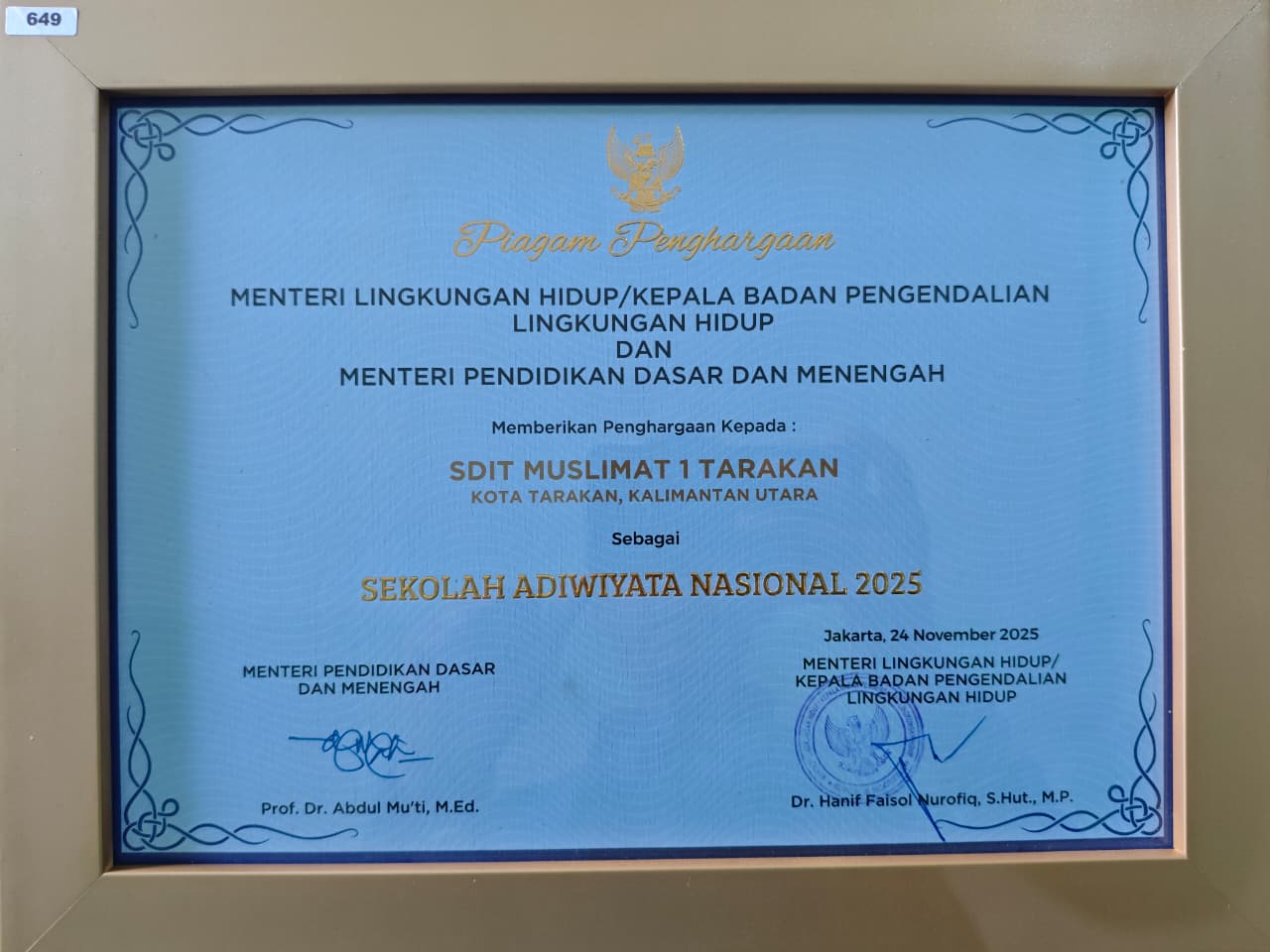 Prestasi ini menjadi motivasi bagi SDIT Muslimat 1 Tarakan untuk terus meningkatkan kualitas pendidikan yang berkarakter, berwawasan lingkungan, serta berkelanjutan. Penghargaan Sekolah Adiwiyata Nasional Tahun 2025 tersebut secara resmi diterima oleh Kepala SDIT Muslimat 1 Tarakan, Hj. Leginah, S.Pd, yang hadir langsung mewakili seluruh warga sekolah dalam rangkaian acara penganugerahan di tingkat nasional. Penghargaan prestisius ini diserahkan secara langsung oleh Bapak Menteri Lingkungan Hidup/Kepala Badan Pengendalian Lingkungan Hidup, Dr. Hanif Faisol Nurofiq, S.Hut., M.P., sebagai bentuk apresiasi dan pengakuan pemerintah atas komitmen, konsistensi, serta peran aktif SDIT Muslimat 1 Tarakan dalam mengimplementasikan program Adiwiyata secara menyeluruh dan berkelanjutan, melalui penguatan kebijakan sekolah berwawasan lingkungan, pelaksanaan pembelajaran berbasis kepedulian lingkungan hidup, kegiatan partisipatif seluruh warga sekolah, serta pengelolaan sarana dan prasarana yang ramah lingkungan demi terwujudnya generasi yang berkarakter, peduli, dan bertanggung jawab terhadap kelestarian lingkungan.